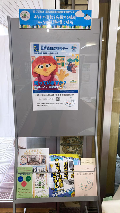 2022/03/23 世界自閉症啓発デー 泉大津の北公民館・南公民館に 一般社団法人泉大津・発達支援勉強会Lienさんの 世界自閉症啓発デーのポスターを掲示させていただきました。 おづぷらざでは、登録団体さんのイベントやお知らせの周知にご協力いたします! ぜひ、お声掛けください。 tagPlaceholderカテゴリ: #自閉症啓発デー